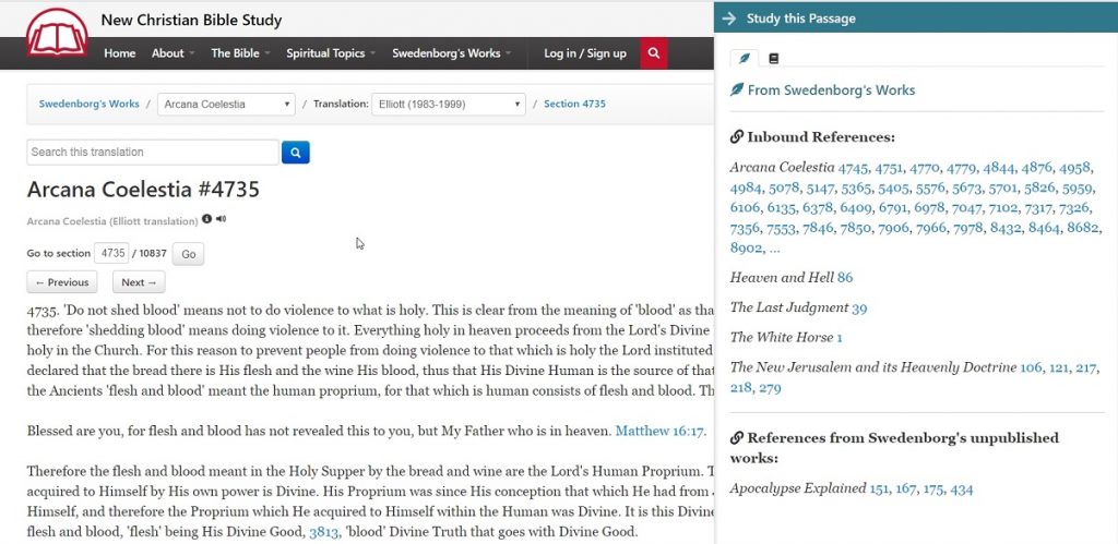 It has 2 tabs in this instance. The first tab with the feather icon is titled “From Swedenborg’s Works” and provide Inbound References. In this particular case, they were passages from Swedenborg’s other books that refer to AC 4735.