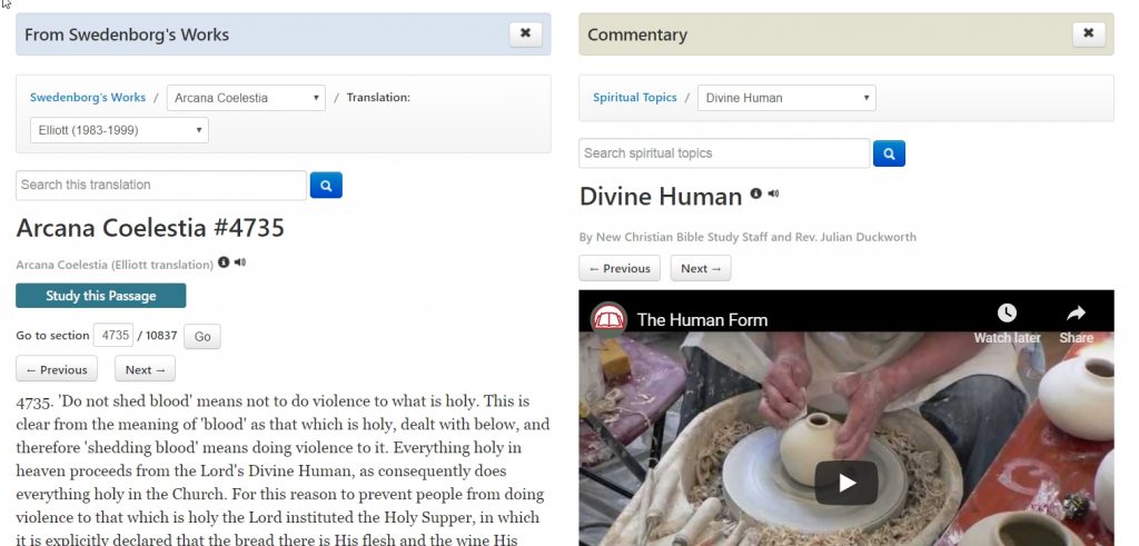 I clicked on the first link having the title “Divine Human 1”. It brought up the Commentary window alongside the AC 4735 passage as shown in the following image.